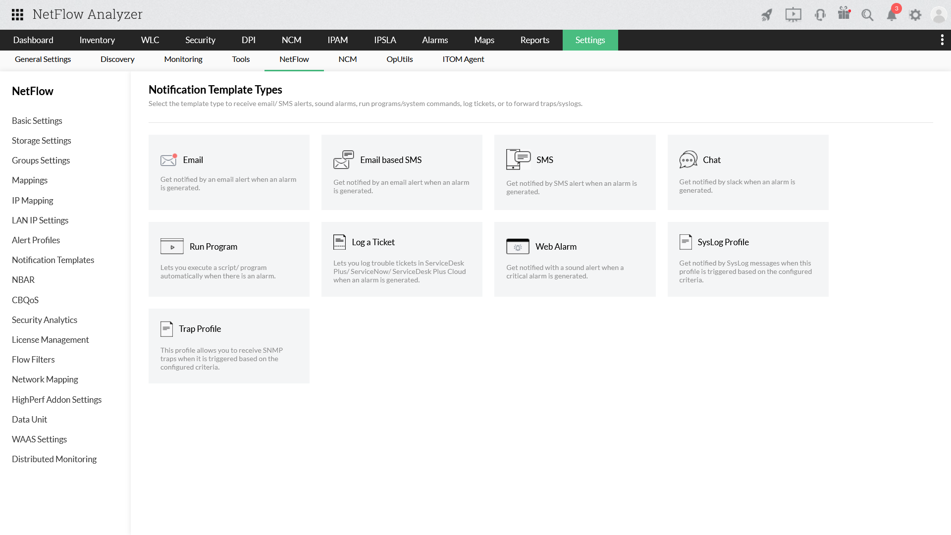 NetFlow Analyzer ensures that app traffic alerts reach you at the right time via the right medium. With a myriad of Notification Templates, such as SMS, Email, Chat, Log a Ticket, and Web Alarm, you can immediately know whenever your network's performance goes down and reduce the average time it takes for you to troubleshoot.