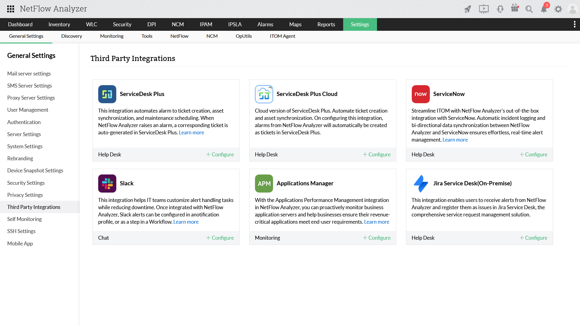 With our application traffic alerting tool, you can get notified by other apps that you regularly use without having to switch between each. As part of Notification Templates, NetFlow Analyzer's third-party integrations with ServiceNow, ServiceDesk Plus Cloud, and Jira let you get application traffic alerts raised as tickets on those platforms.