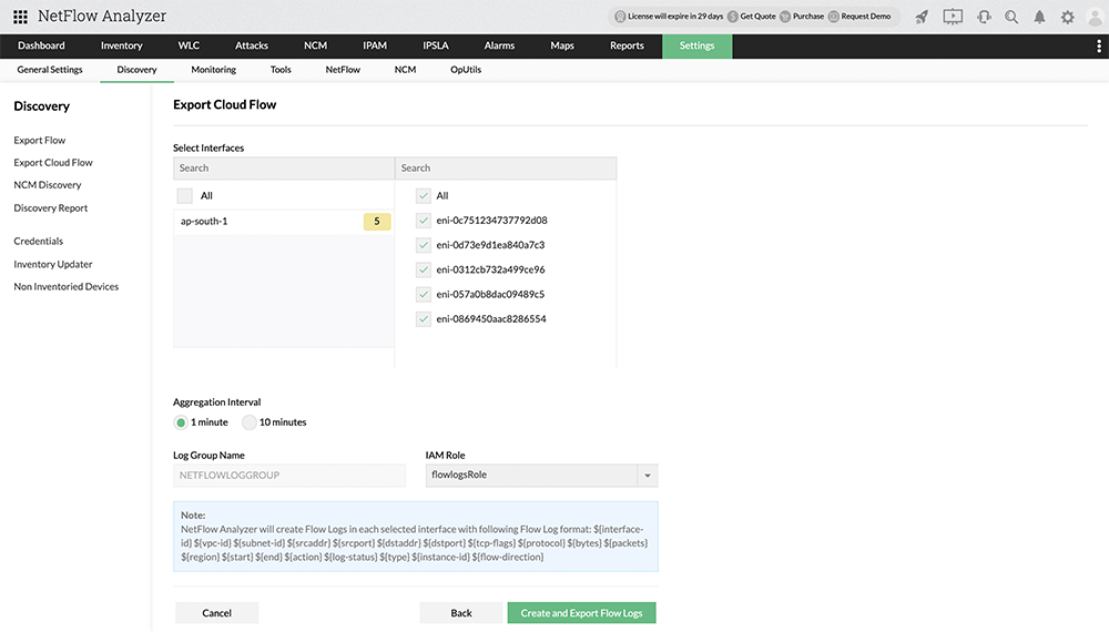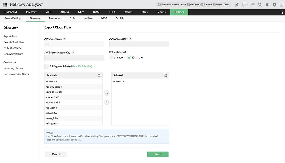 Under the Export Cloud Flow tab in Settings, provide credentials such as AWS Access Key and Secret Access Key, and selecting Regions and Polling Interval to enable access to AWS.