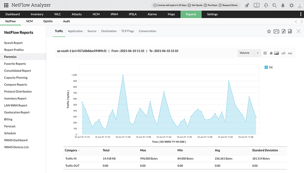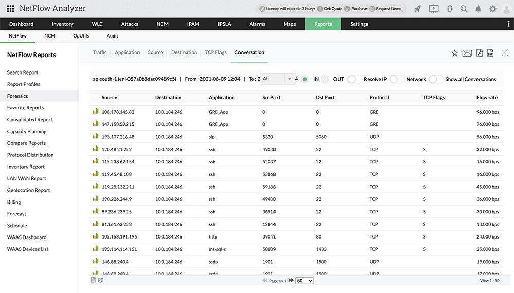 NetFlow Analyzer's cloud flow monitoring feature helps you monitor VPC cloud interfaces in detail using the Search and Forensics reports. These reports provide you with in-depth interface-based information including IN and OUT Region Name, Interfa Name, Source and Destination IP, associated Applications, Port, Protocol, Traffic, TCP Flags, and Conversations.