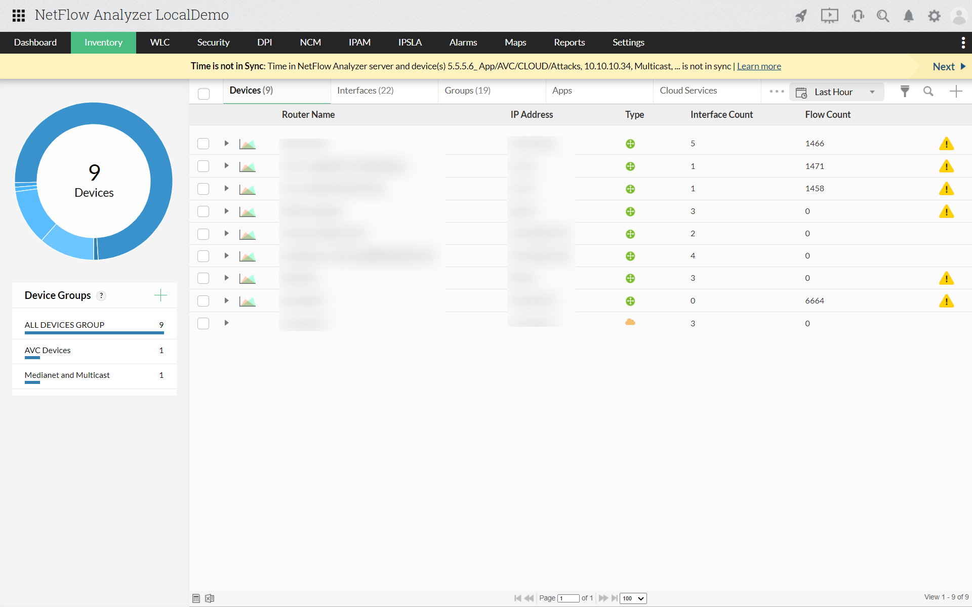 The Devices tab in the Inventory section helps you gain visibility by providing a complete overview of the VPCs and their status, and allowing you to drill down to each of them to monitor individual interfaces, Flow Count, IN and OUT traffic, Source and Destination details, Applications, and Conversations. - Reports