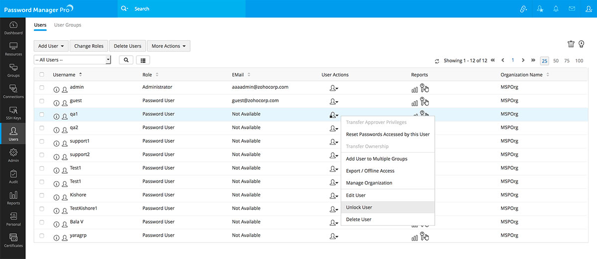 - Alternatively, you can also activate individual user accounts by locating the required user, clicking on User Actions icon beside the user, and selecting Unlock User from the drop down menu as shown below: