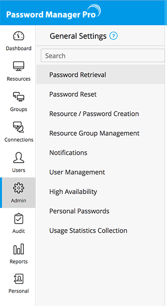 Using the General Settings section of Password Manager Pro, you can carry out important setting changes such as enforcing Password Policies, enabling the Forgot Password option to reset user passwords, configuring to send Email Notifications on user creation or role modification, provision for managing Personal Passwords, exporting resources, remote password reset and so on.