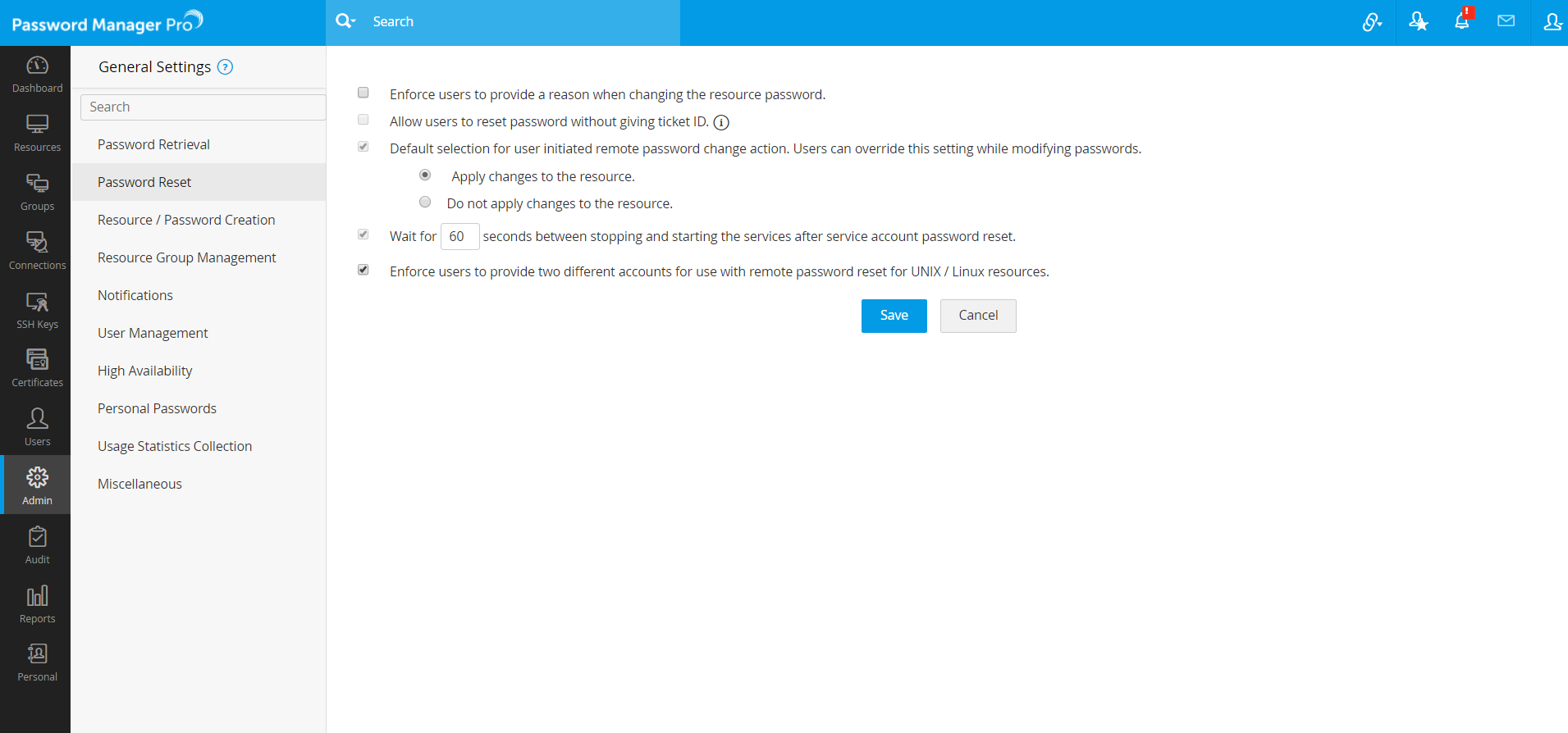 If ticketing system integration is done in your environment, then by default, users will be prompted to provide a ticket ID when they try to reset the password of a resource. Enable this option to allow users to reset passwords without providing a ticket ID.