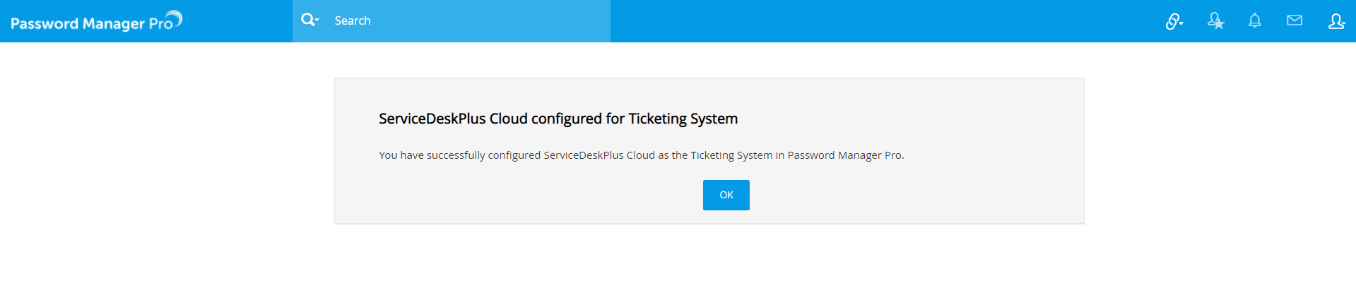 - ServiceDesk Plus Cloud has been configured successfully as ticketing system in Password Manager Pro.