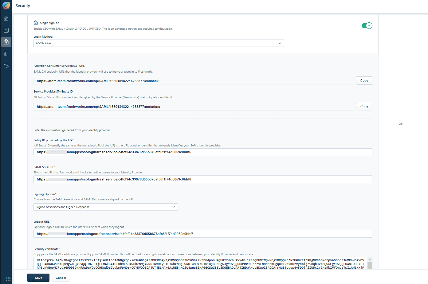 - Paste the URLs copied in Step 4 of the Prerequisites in the Entity ID, SAML SSO URL, and Logout URL fields respectively.