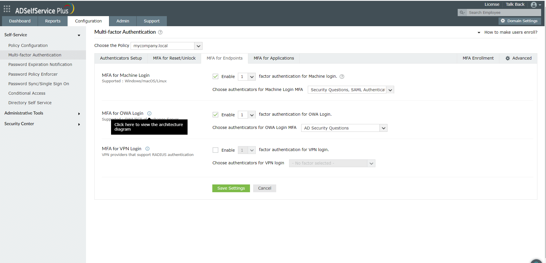 With this setting, you can enable MFA for Outlook on the Web (OWA) and Exchange admin center logins to add an additional layer of security to your Exchange environment. Let's see how you can enable MFA with ADSelfService Plus: