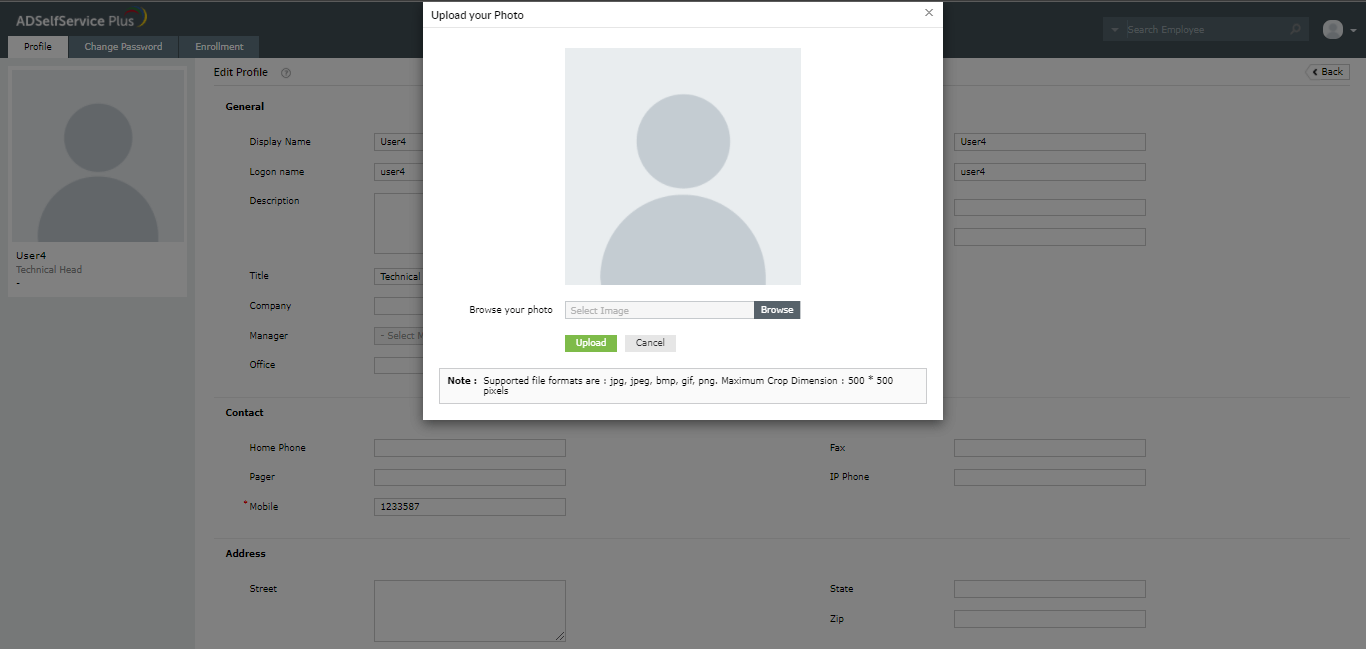 ManageEngine ADSelfService Plus is an integrated self-service password management and a single sign-on (SSO) solution. It allows the user to update their Active Directory profile picture through its Self-Service Directory Update feature.