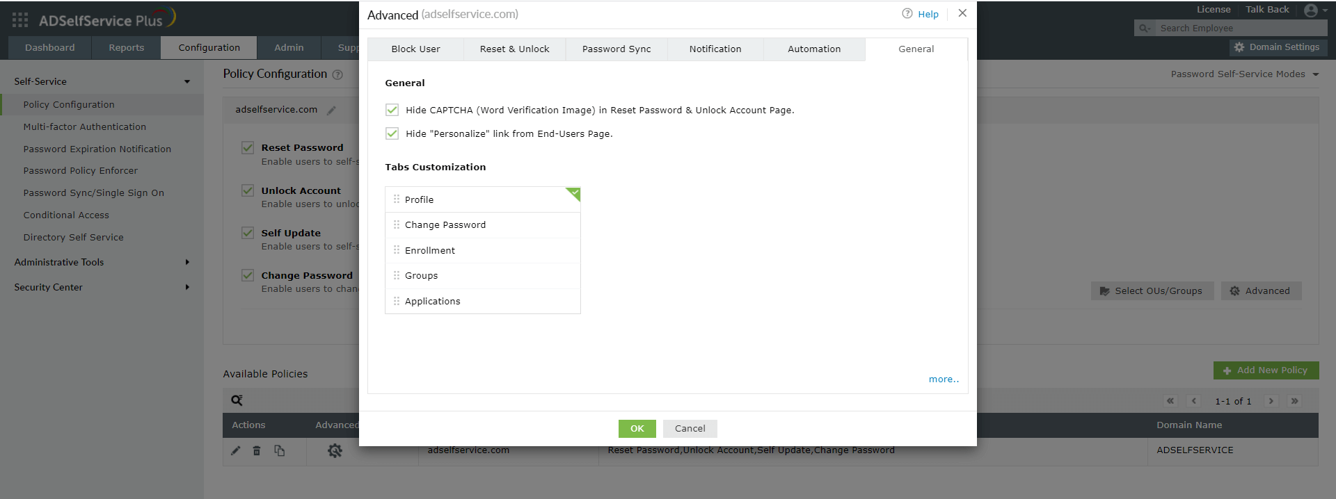 The General tab contains settings related to CAPTCHA verification, personalization link and tab customization. These are the settings that come under the General tab: