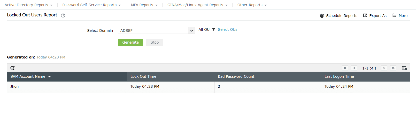 - Locked-Out Users Report: This report provides information on domain users who have been locked out of their accounts due to entering incorrect passwords.