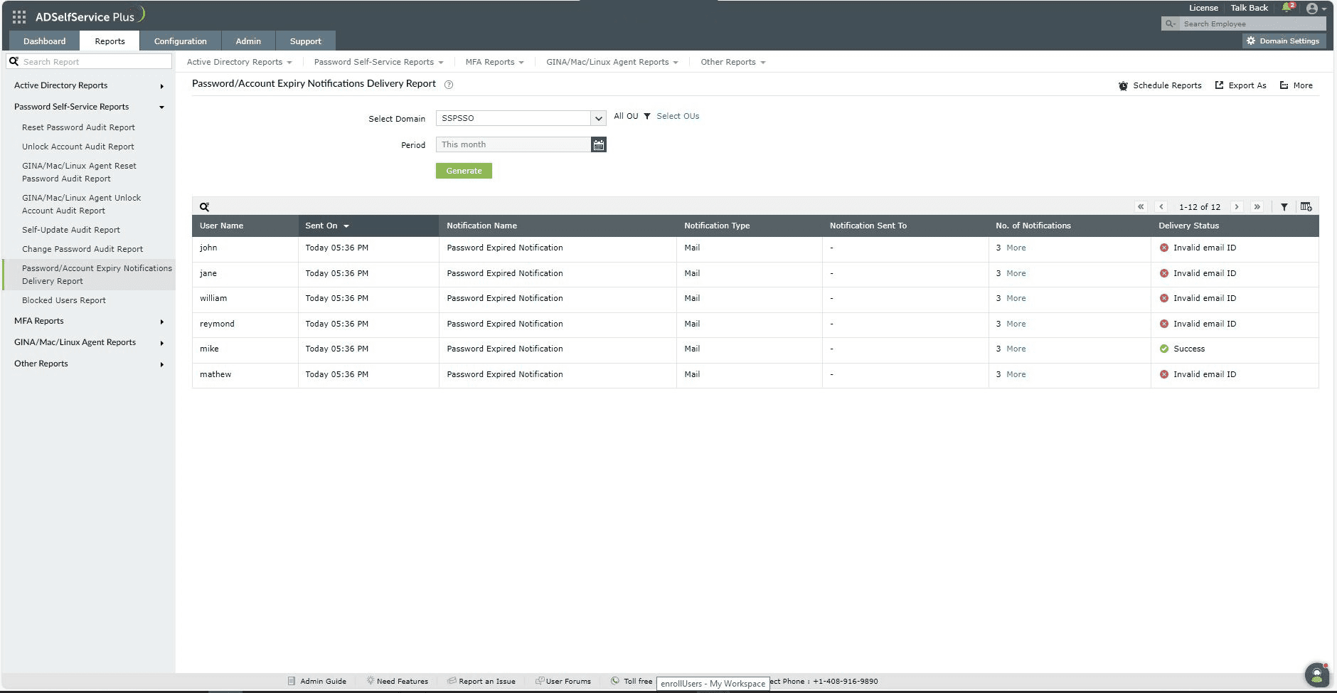 - Password/Account Expiry Notifications Delivery Report: This report provides information on the delivery status of the password and account expiration notifications sent by ADSelfService Plus during the specified time frame.