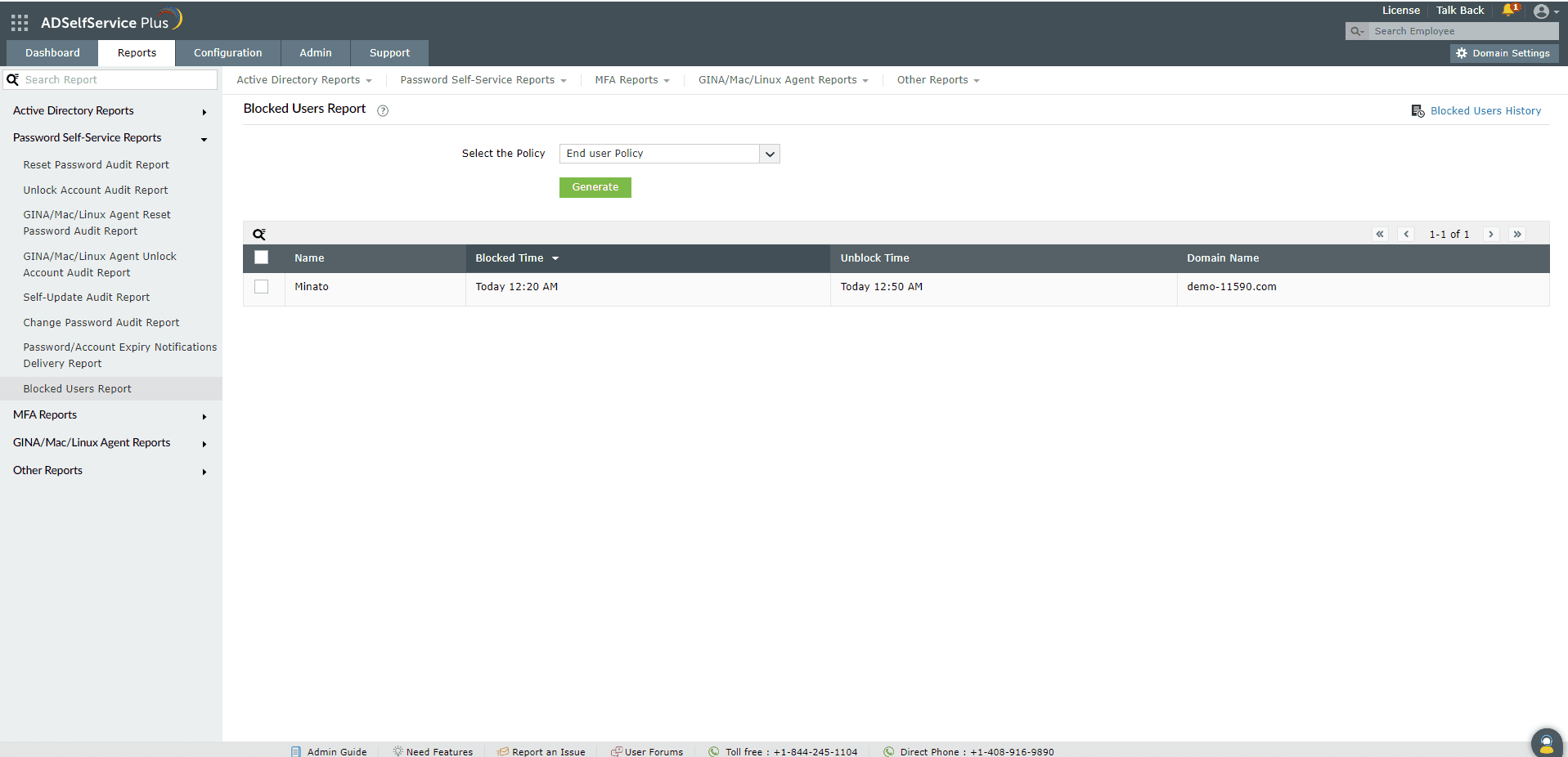 - Blocked Users Report: Generates the list of users who have been blocked from accessing ADSelfService Plus.