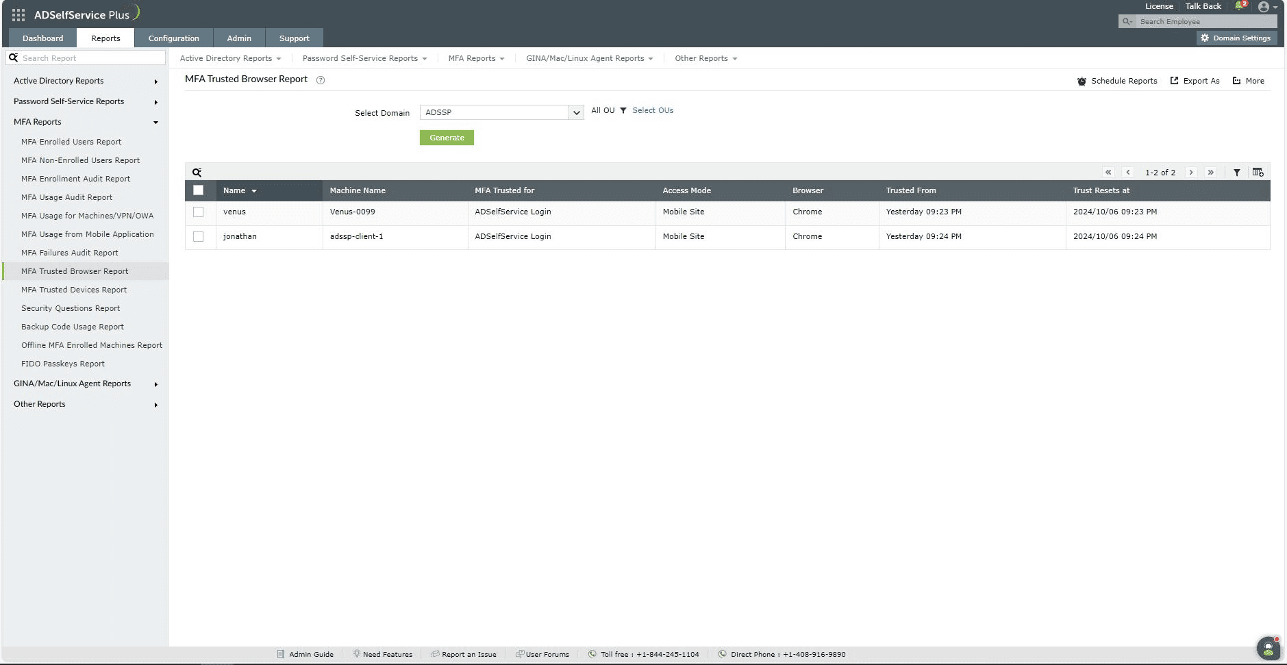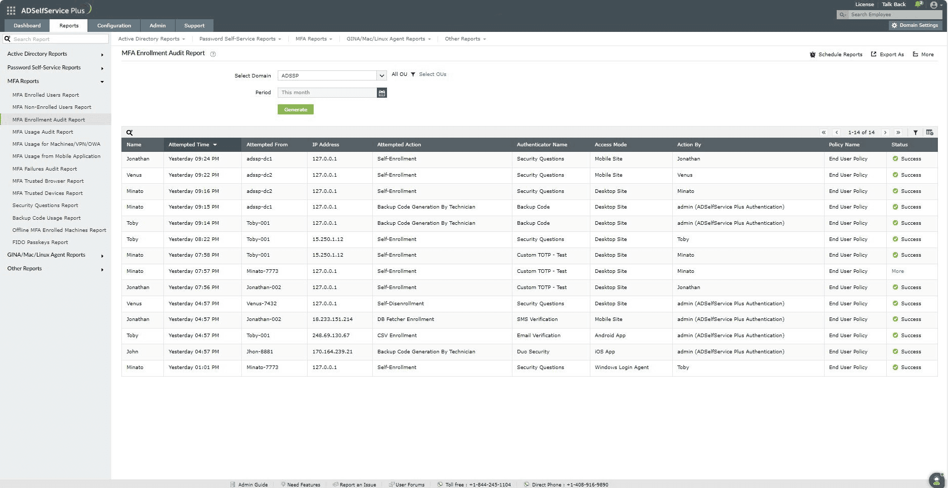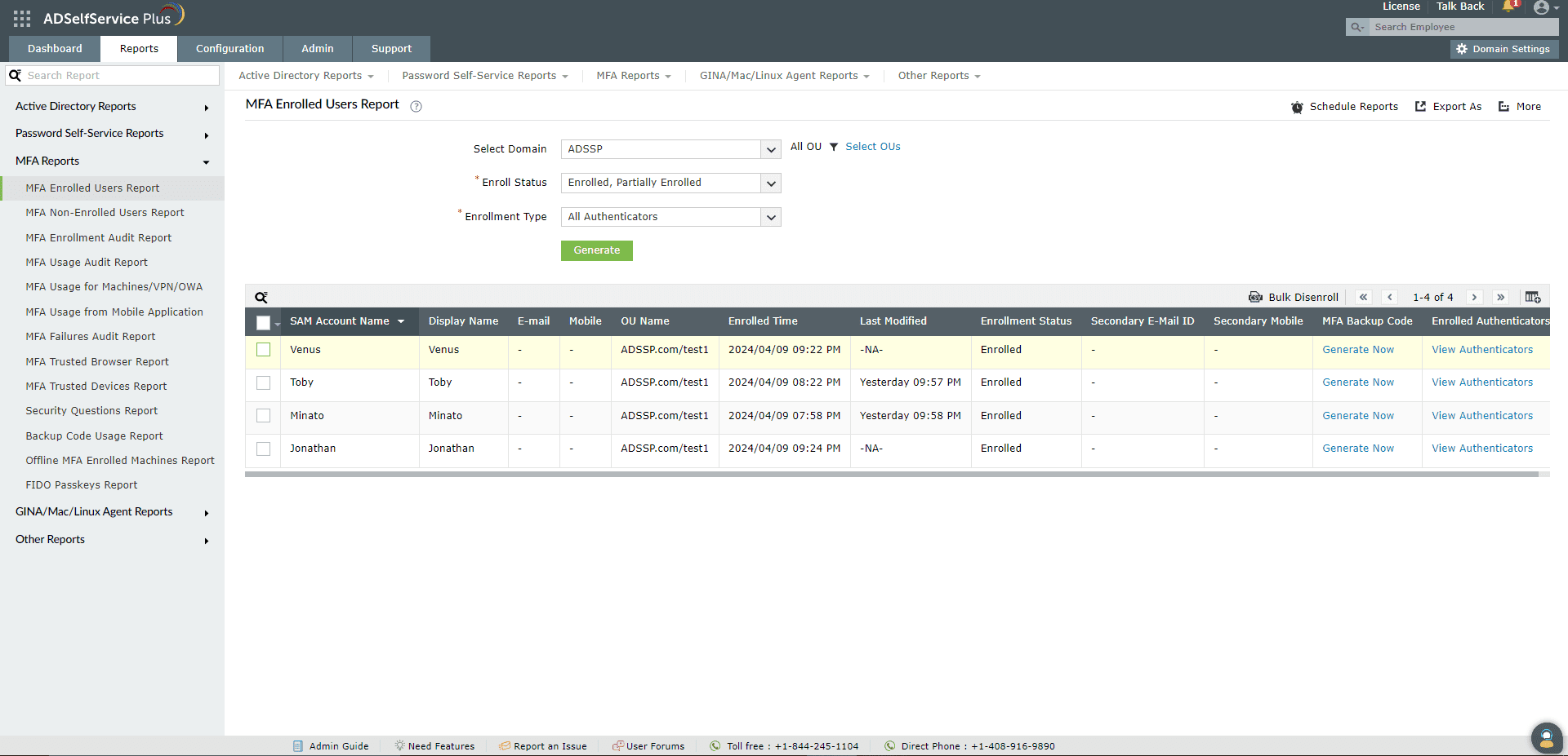 - MFA Enrolled Users Report: This report lists the users who have self-enrolled in MFA for ADSelfService Plus.