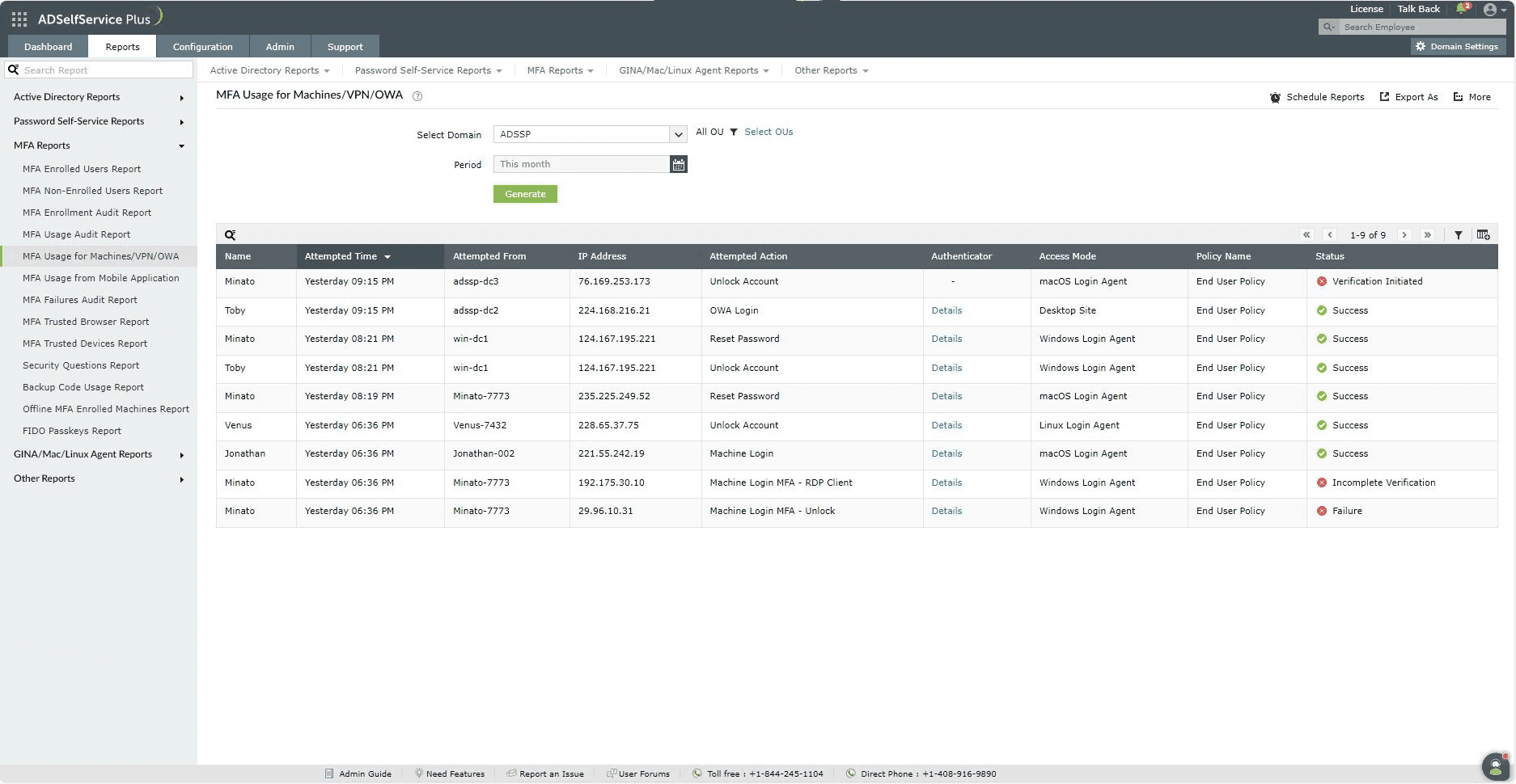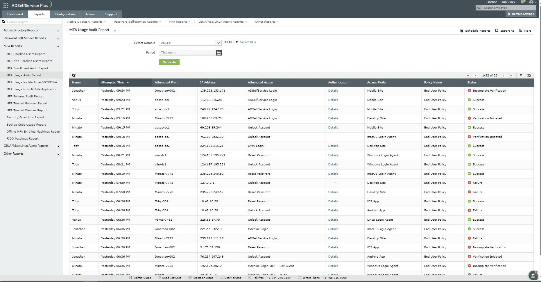 - User Attempts Audit Report: This report generates the list of users who have made authentication attempts using both passwords (primary credentials) and MFA (secondary authentication).