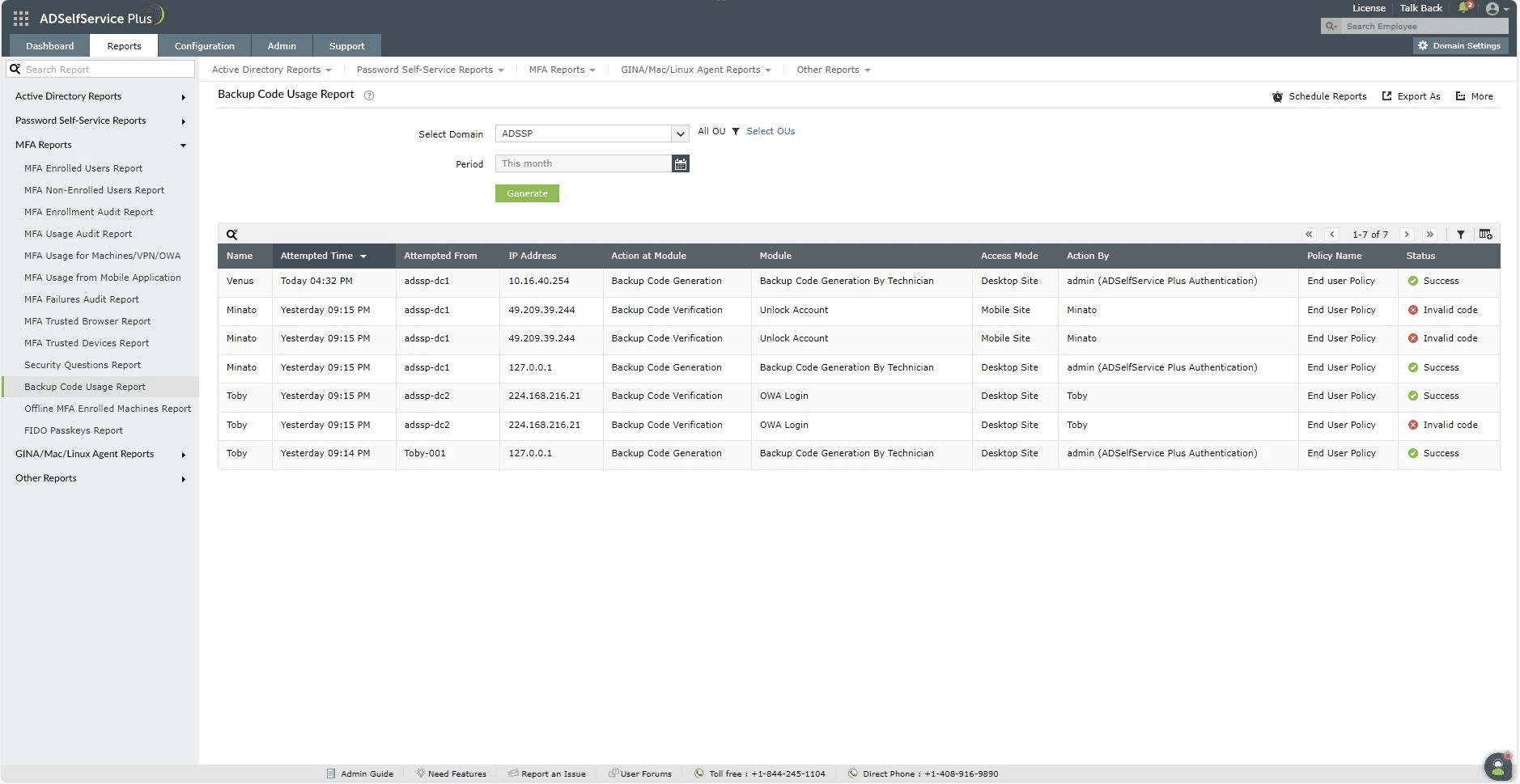 - Backup Code Usage Report: This report provides information on backup code usage or generation for ADSelfService Plus accounts.