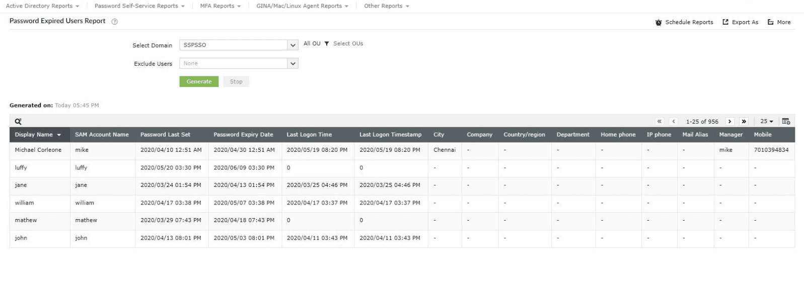 - Password Expired Users Report: This displays the list of users whose passwords have expired in accordance with the enforced domain policy.