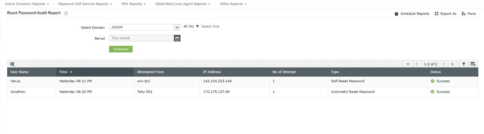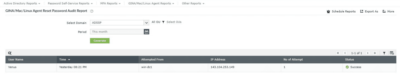 - Reset Password Audit Report: Admins can get an overview of the users who have performed password resets through specific access points over a specific period. This report also lists the password changes via the Password Sync Agent.