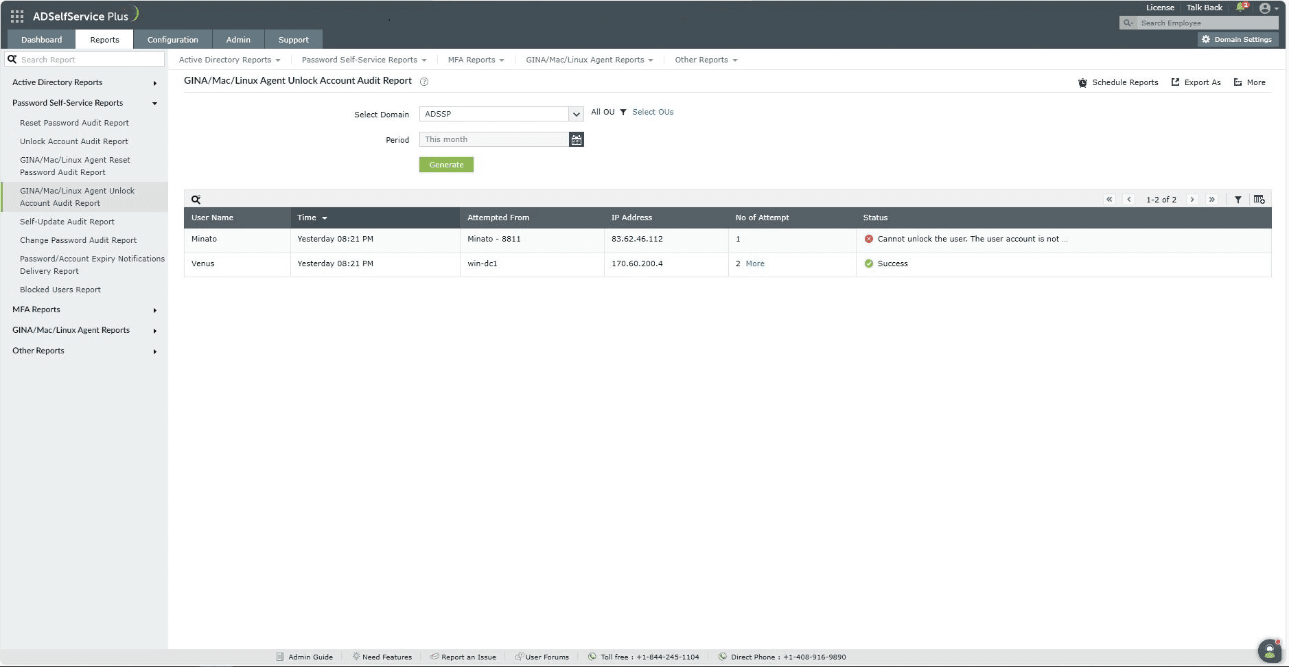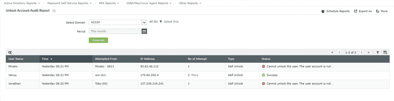 - Unlock Account Audit Report: This report helps admins get an overview of the users who have performed self-service account unlocks over a specific period.
