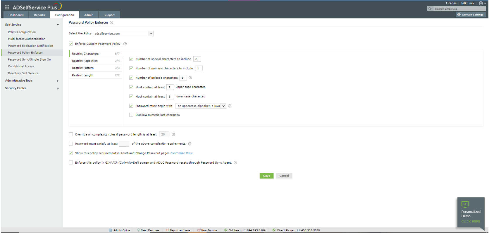 - Go to Configuration > Self-Service > Password Policy Enforcer. Enable Enforce Custom Password Policy.