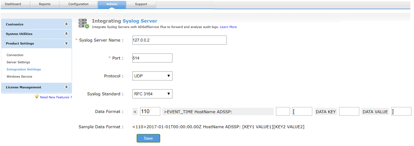 ADSelfService Plus can be integrated with syslog servers and SIEM (security information and event management) solutions that support syslog format such as Splunk and EventLog Analyzer, so that you can forward audit logs in real time and gain valuable insights on your users’ activities.