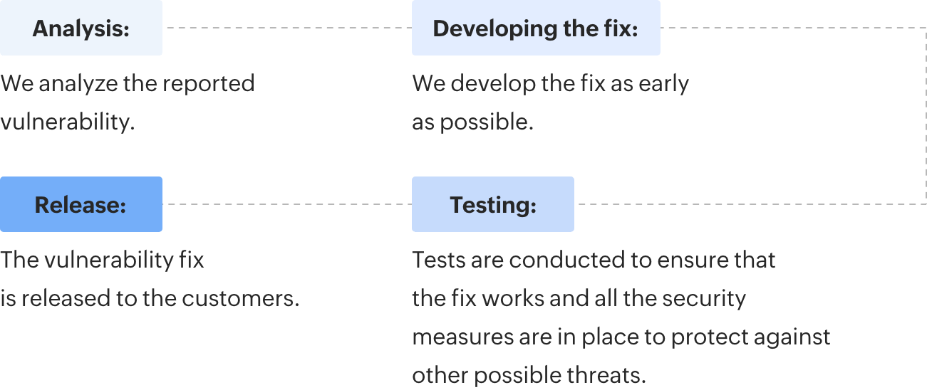 ManageEngine also conducts bug bounty programs where individuals or groups from within ManageEngine along with external people, communities, and security experts can notify us if any vulnerability in our solutions has been identified. We immediately begin working on developing and releasing a fix for the vulnerability in such cases.