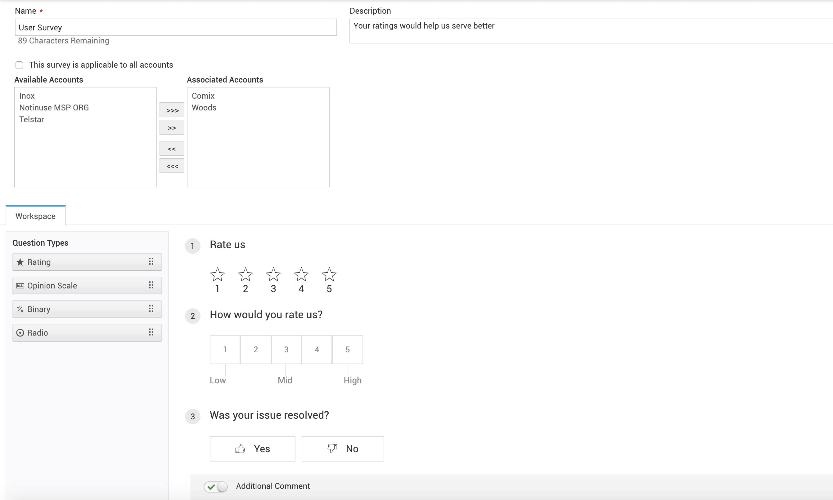 ServiceDesk Plus MSP provides a user-friendly interface to set up User Surveys that can be customized with different types of questions such as ratings, opinion scale, binary, or radio.