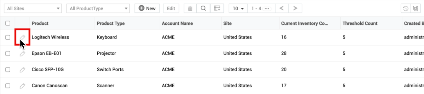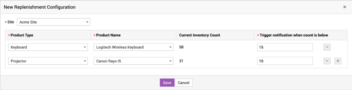 Edit Replenishment Configuration You can edit only the threshold limit of replenishment configuration in the Trigger notification when count is below field. Fields such as Site, Product Type, and Product Name are non-editable.
