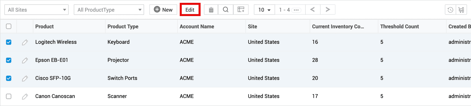 To bulk edit, select the checkboxes beside the replenishment configurations and click Edit on the toolbar.