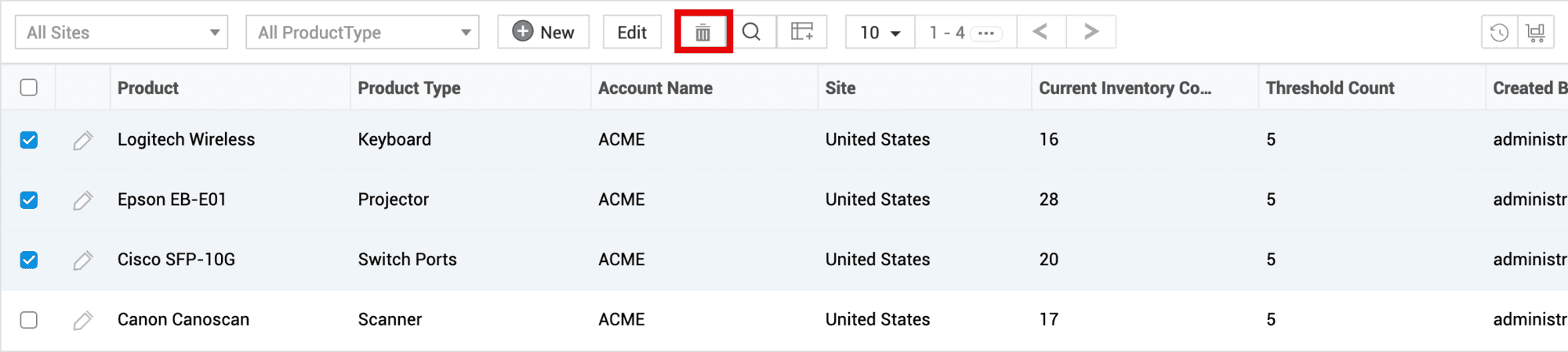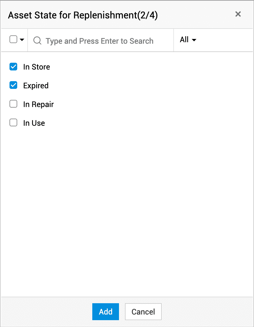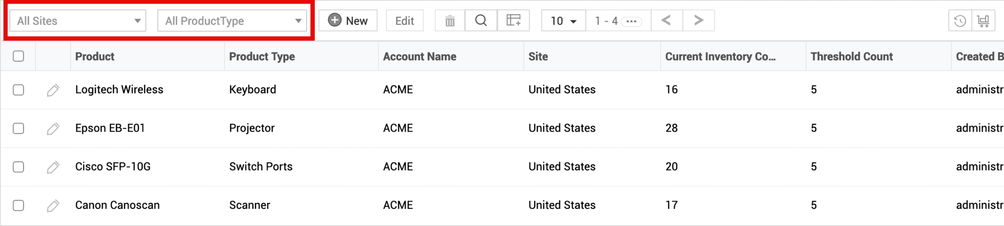 Filter Replenishment Configurations - You can filter the asset replenishment configurations displayed based on the Site and Product Type.