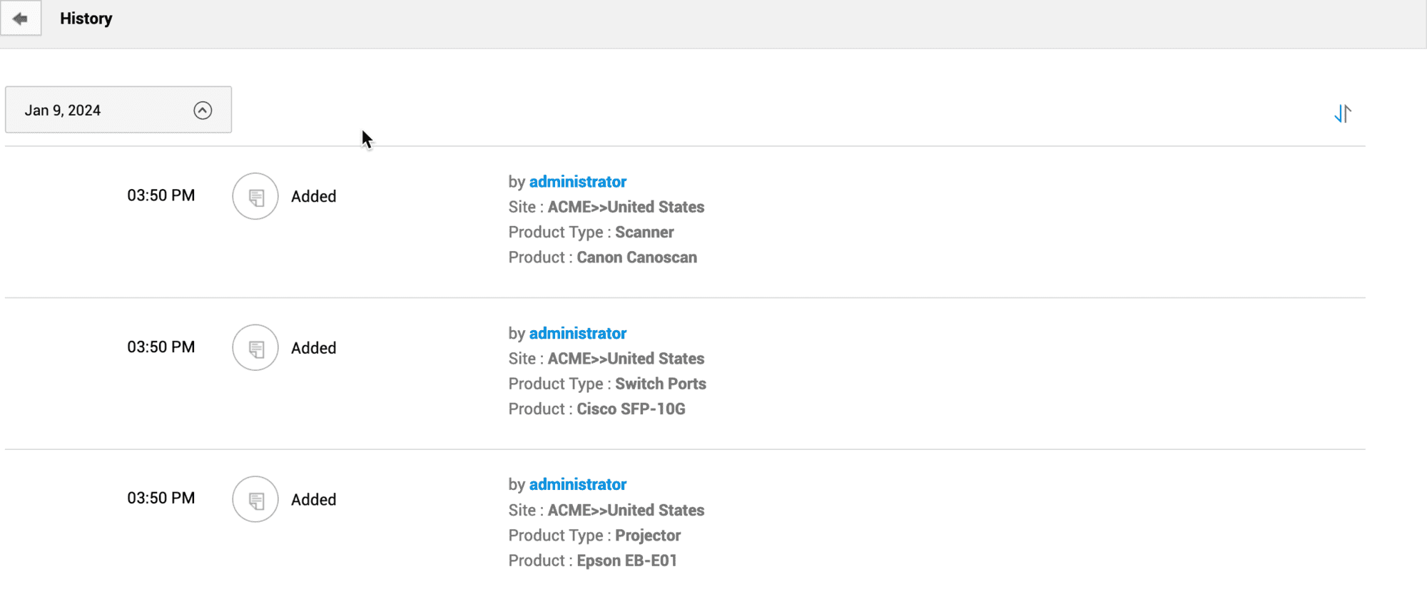 History History records the replenishment configuration actions performed by technicians from all sites. To view history, click the Click