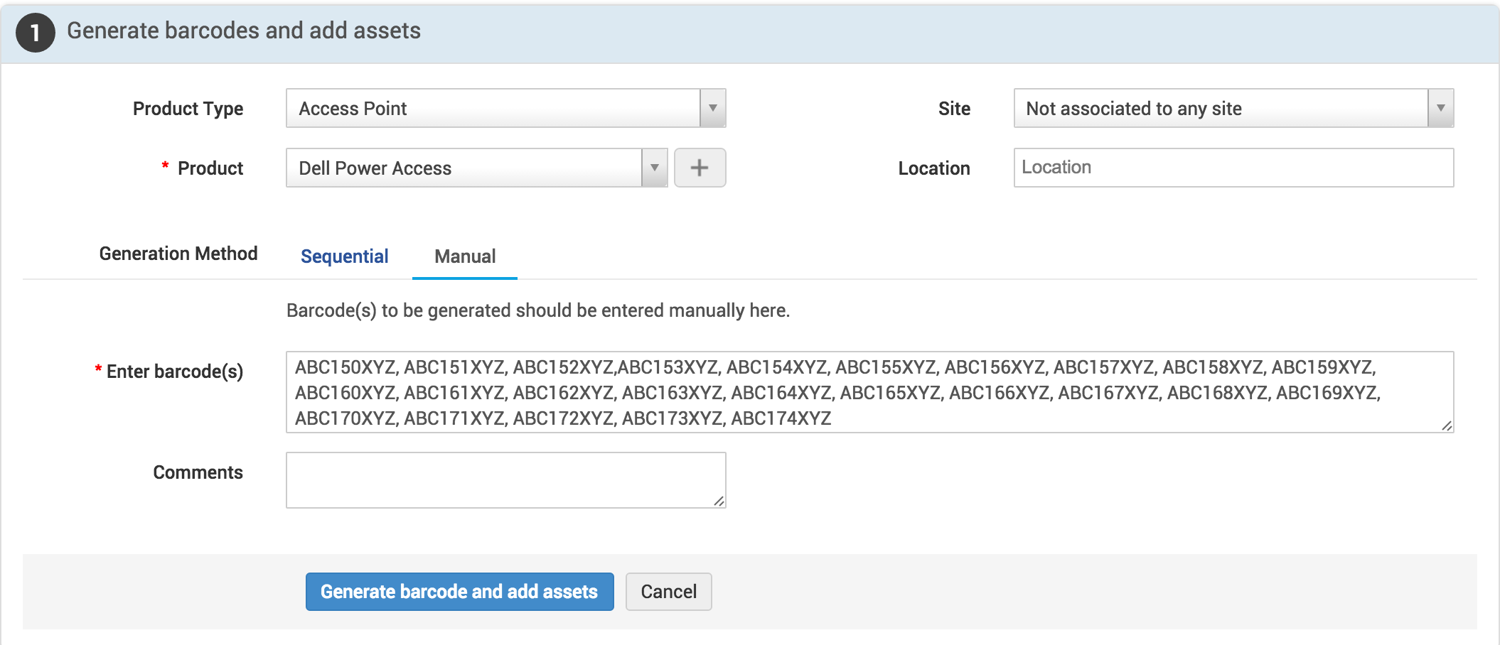Assets can be added by generating custom barcodes as well. Use this to generate your own barcodes(s) for the assets you are adding.