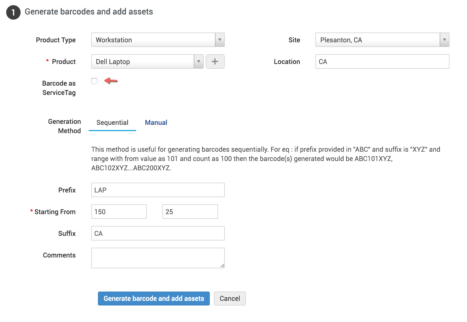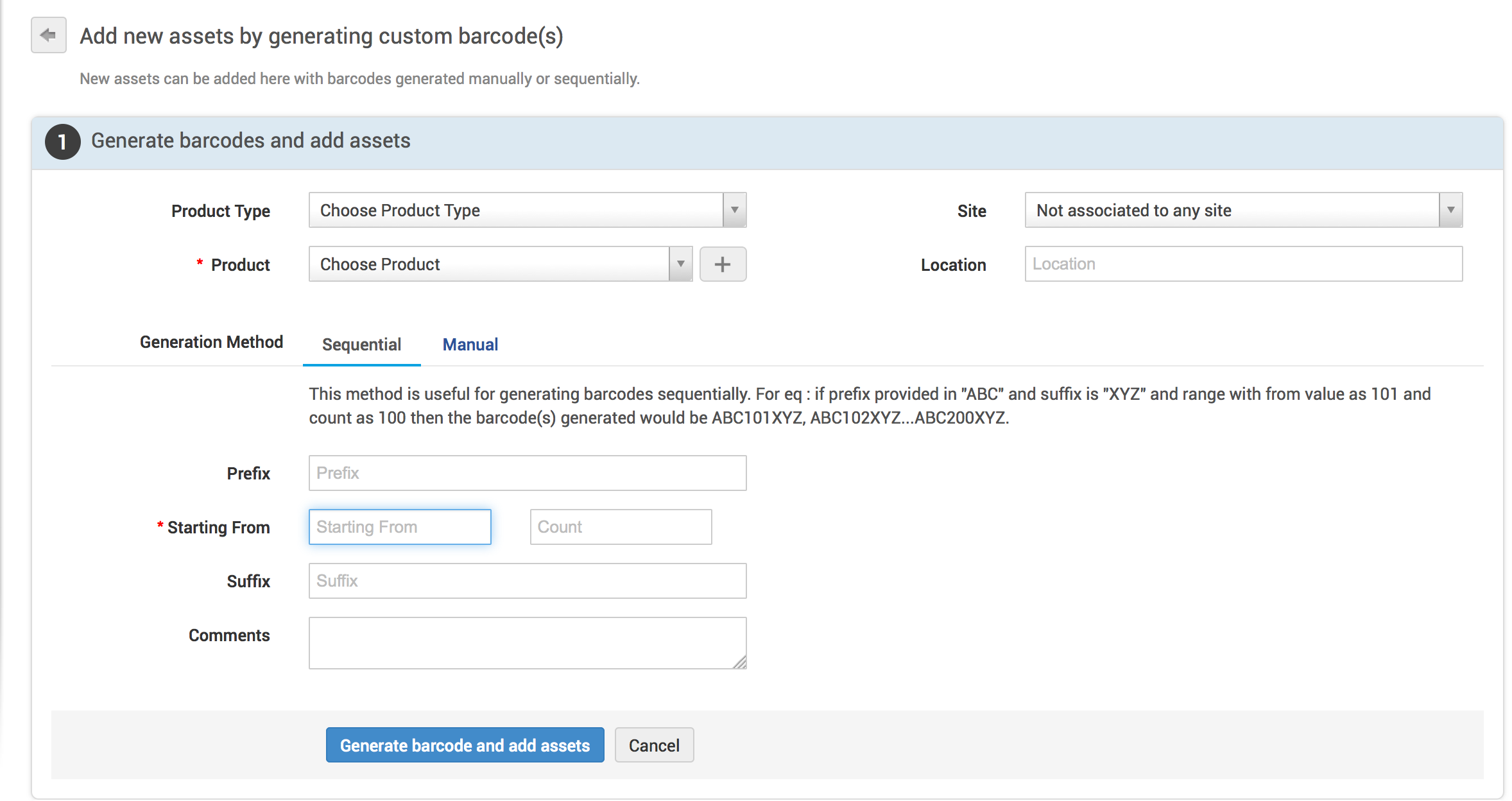 Select the Sequential Method to generate barcodes sequentially by giving a "Starting From" value and the assets count.
