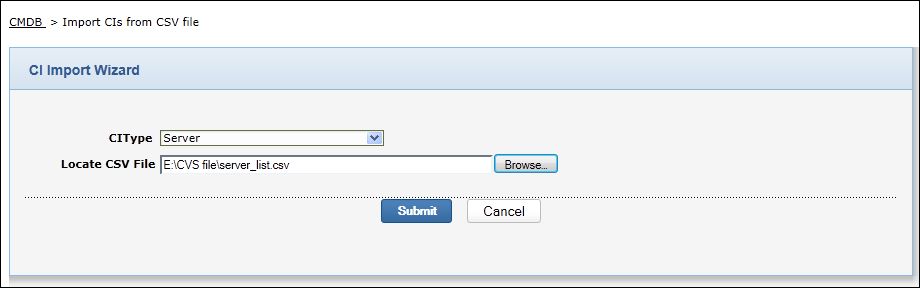 Click Import CIs from CSV file link. The CI Import Wizard is displayed.