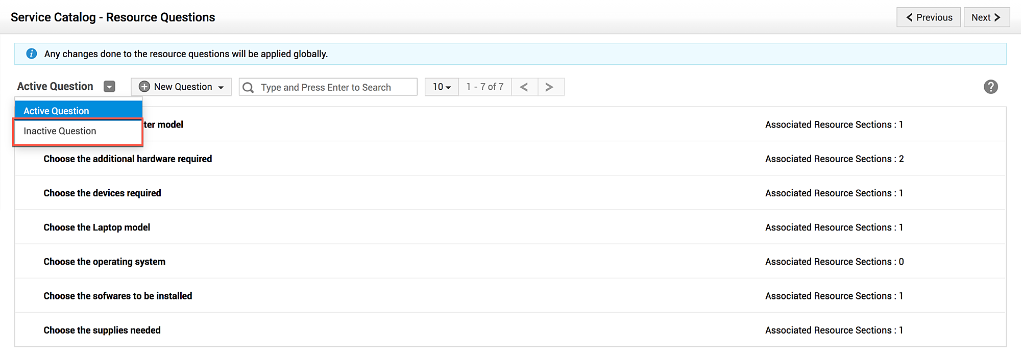 To view inactive questions, use the filter drop-down on the top-right corner of the list view page.