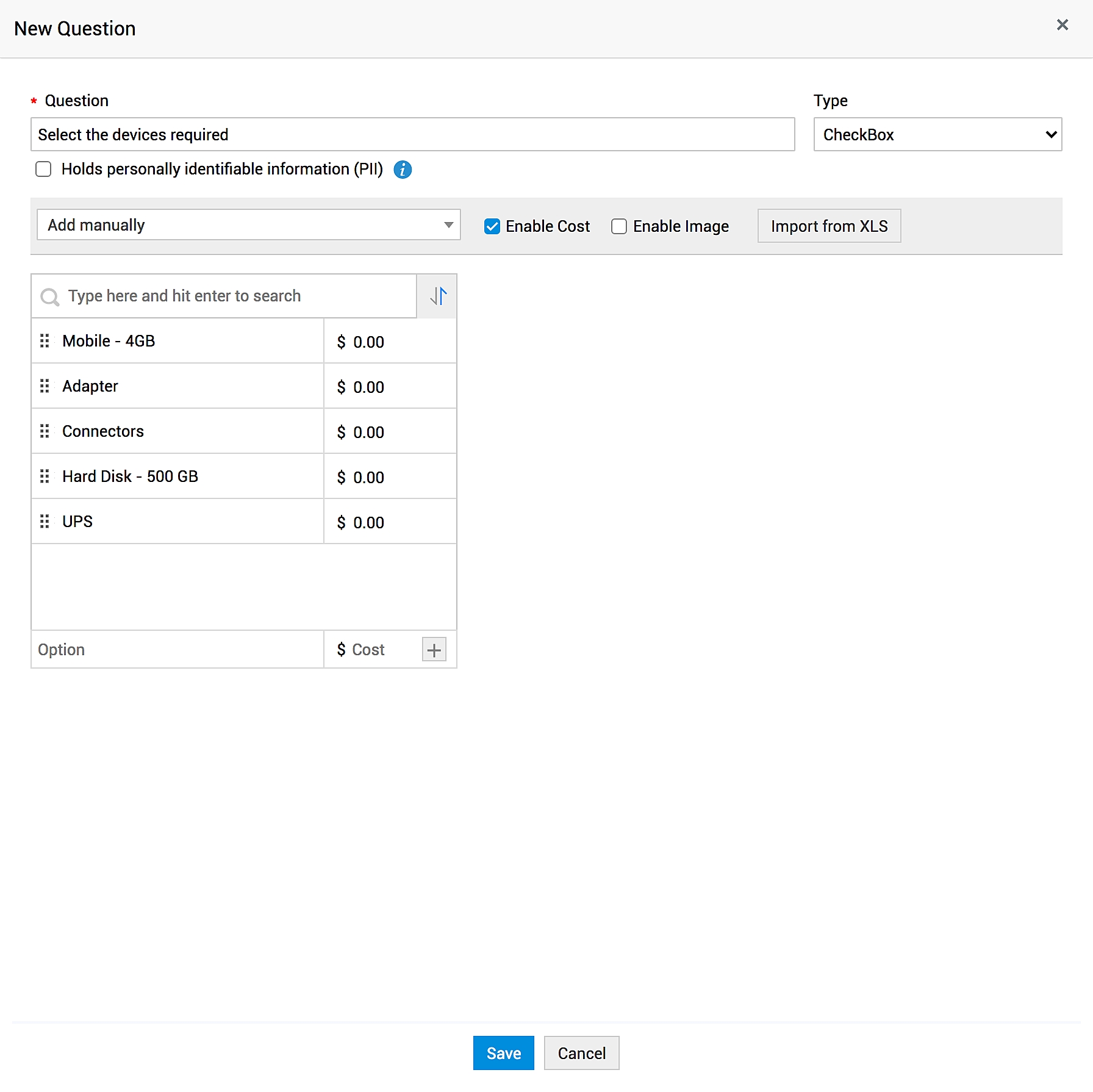 Import from XLS file - Import your options and their cost from an XLS file. The sheet number is auto-populated. Map the Name and Cost fields to the relevant columns in the XLS file and click Import.