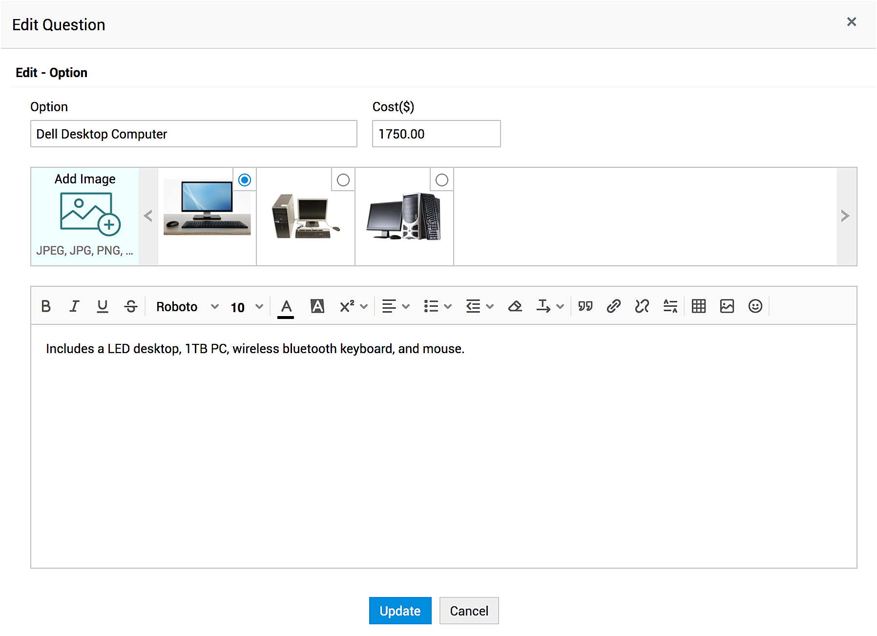 icon to upload a picture from your device. The picture can be in .jpg, .png, .jpeg, .bmp formats and not more than 5MB in size. You can add up to 5 images per option. -