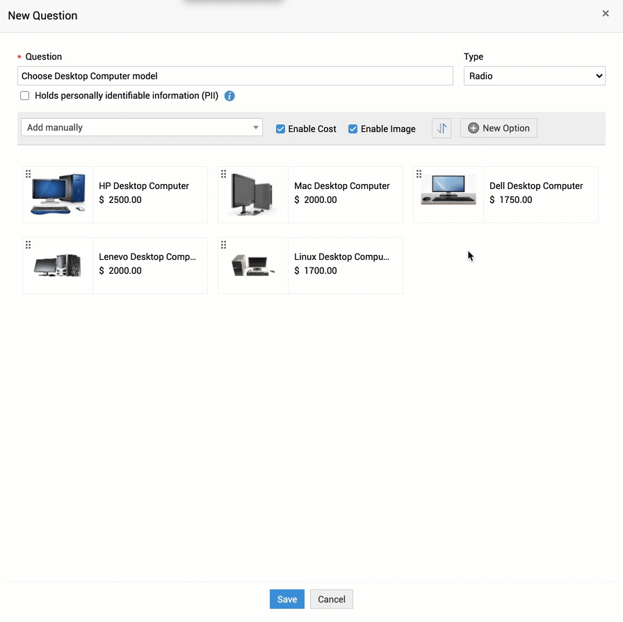Select Enable Image to add a reference picture and make it easy for your users to select the exact resource they need. Note that if images are enabled, you can only add options manually using the New Option button.