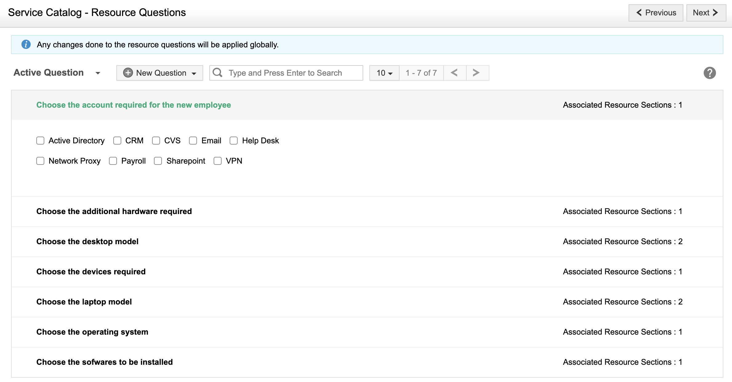 Resource Questions enable administrators to compile resource-related questions that collect additional information about the requested service. Resource questions can be associated with multiple service templates via resource sections.