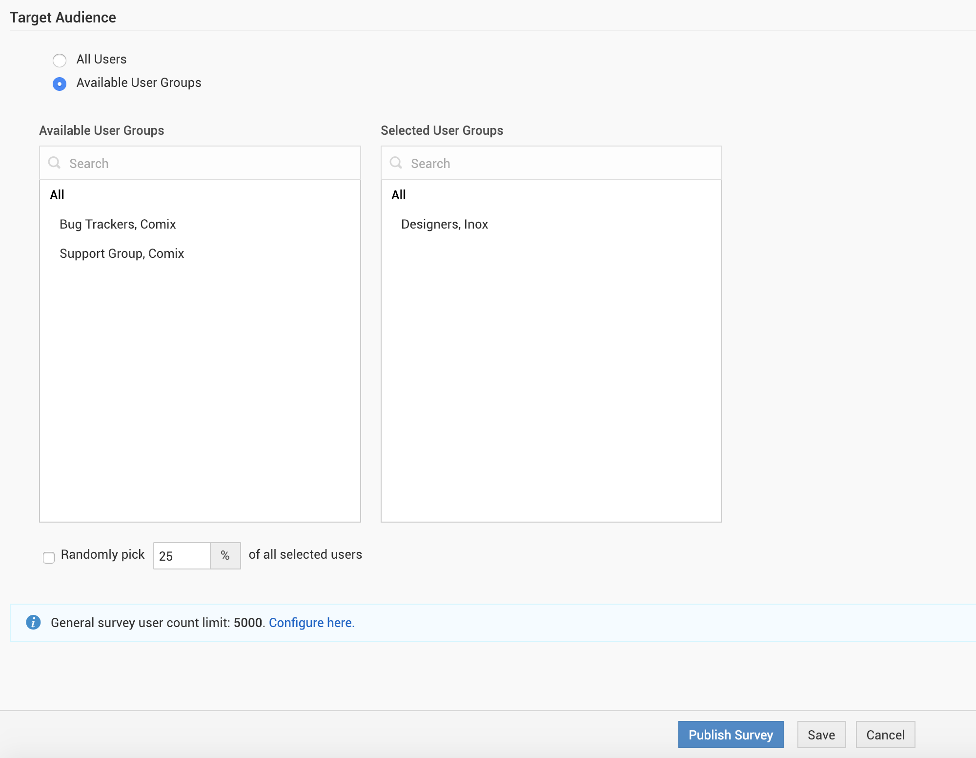 • You can further limit the selected users' count by setting only a percentage of them to be randomly picked for the survey.