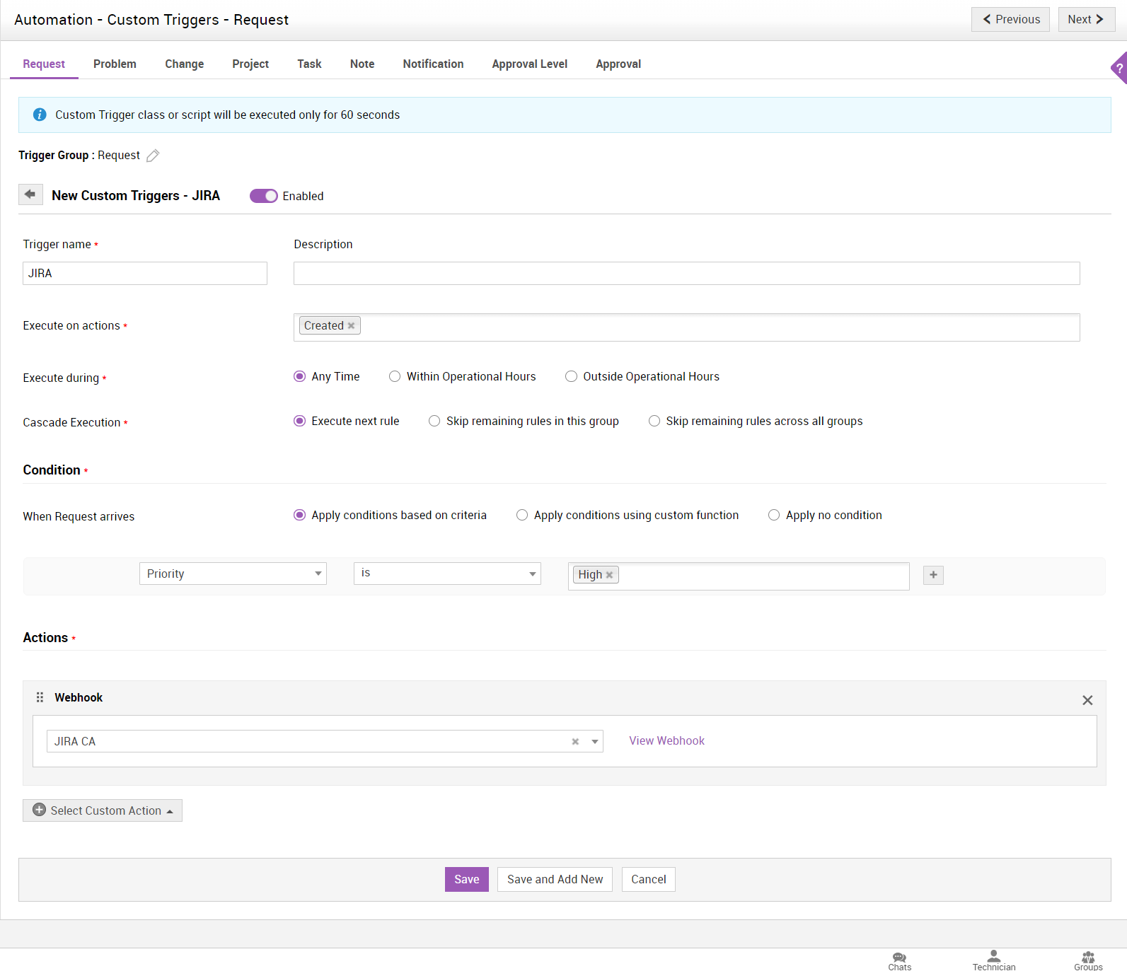 A webhook can be created using the global function of DELUGE. Using Deluge scripting, you can build custom functions that can manipulate data within ServiceDesk Plus MSP and other external applications.