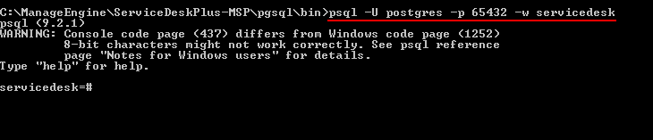 C:\> cd ManageEngine\ServiceDeskPlus-MSP\pgsql\bin> psql.exe -U postgres -p 65432 -w servicedesk