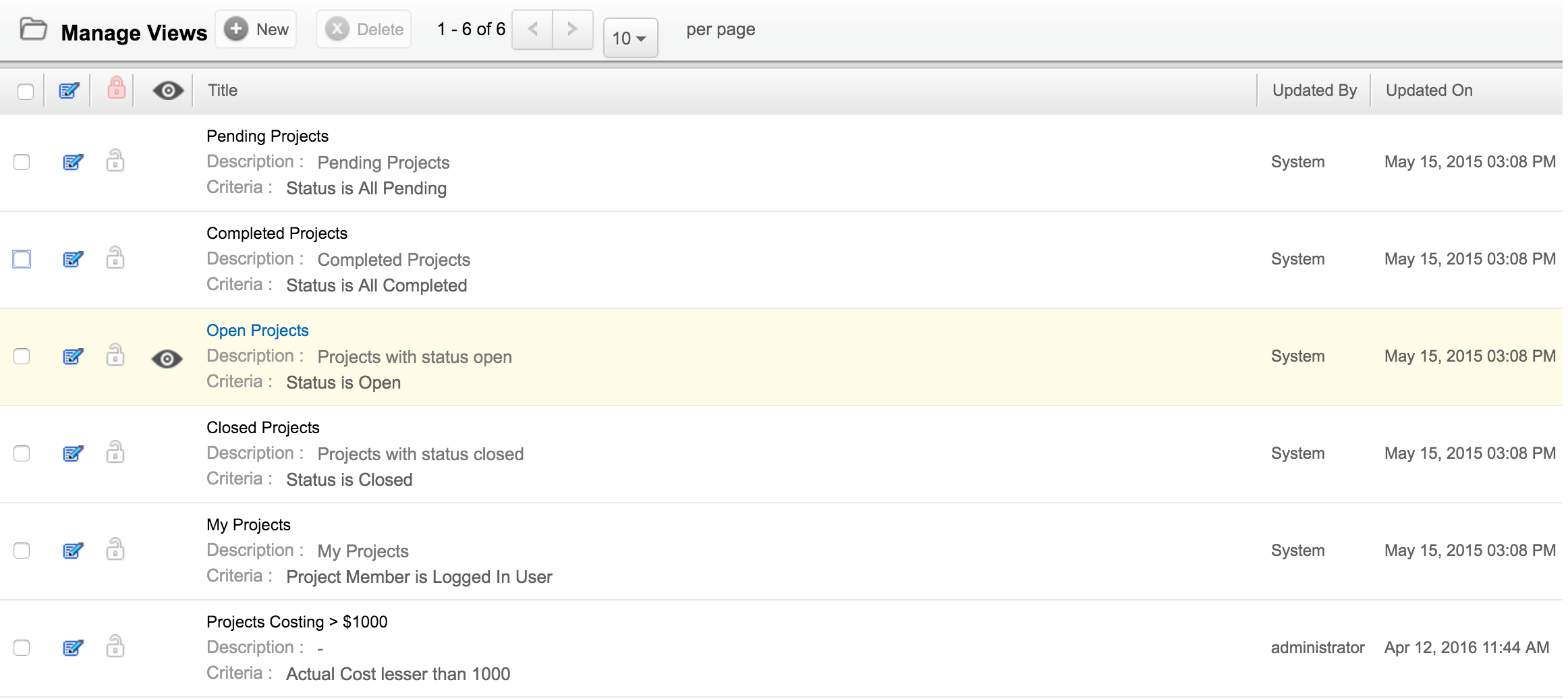 In addition to the default project views such as Open Projects, Closed Projects, Pending Projects and My Projects, ServiceDesk Plus MSP introduces Projects Custom View which equips the users to add filters as per their requirement. For eg, You can customize new views such as "Projects costing more than $1000", "Projects starting today", "High Priority Projects" etc. These views can be configured with filter conditions and can be used in the projects list view.