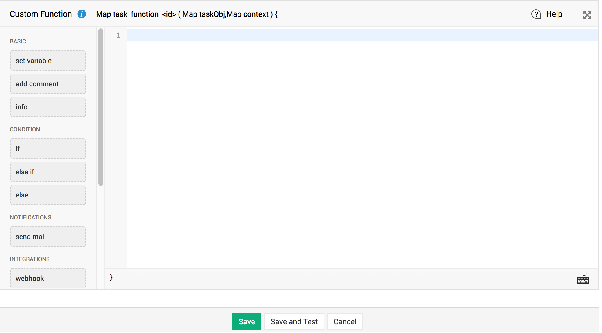 As demonstrated in the following screenshot, 'taskObj' and 'context' will be passed as arguments for the custom function:
