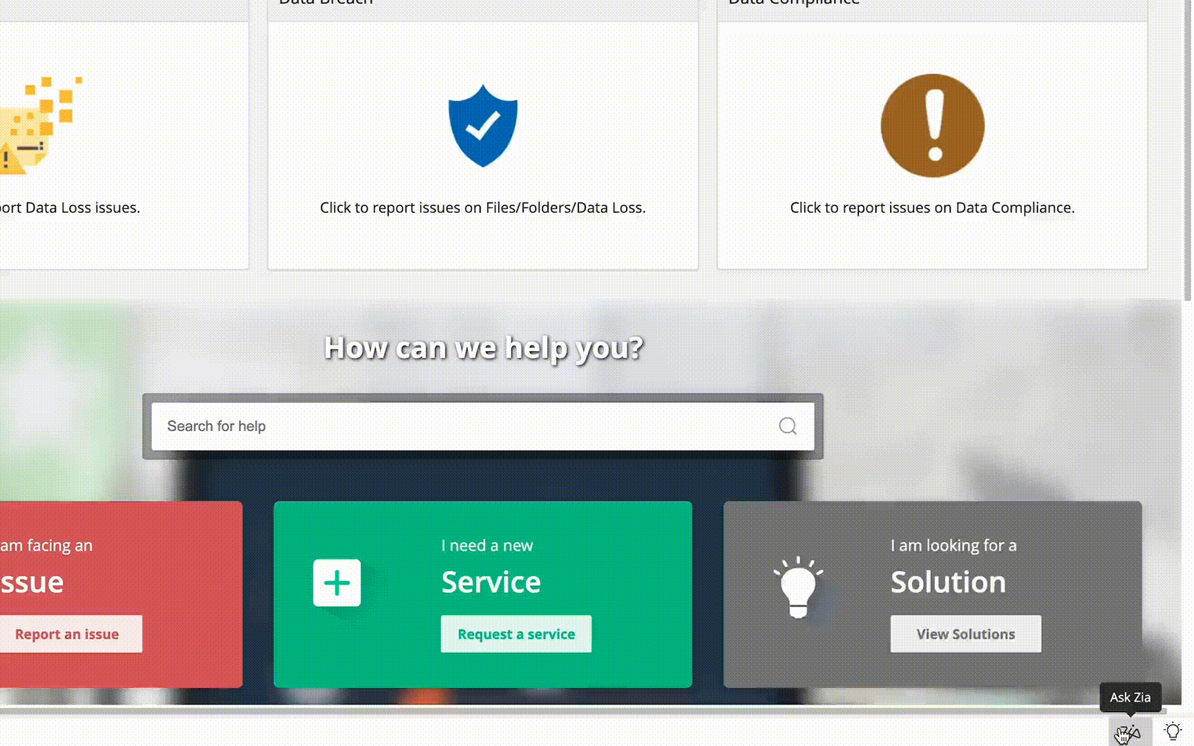 Allow users to perform service desk actions, like browsing solutions, creating tickets, and viewing existing tickets–all from within the Zia chat box.