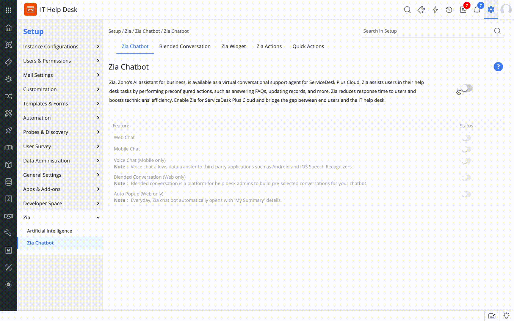 Setup > Zia > Zia Chatbot > Blended Conversation.