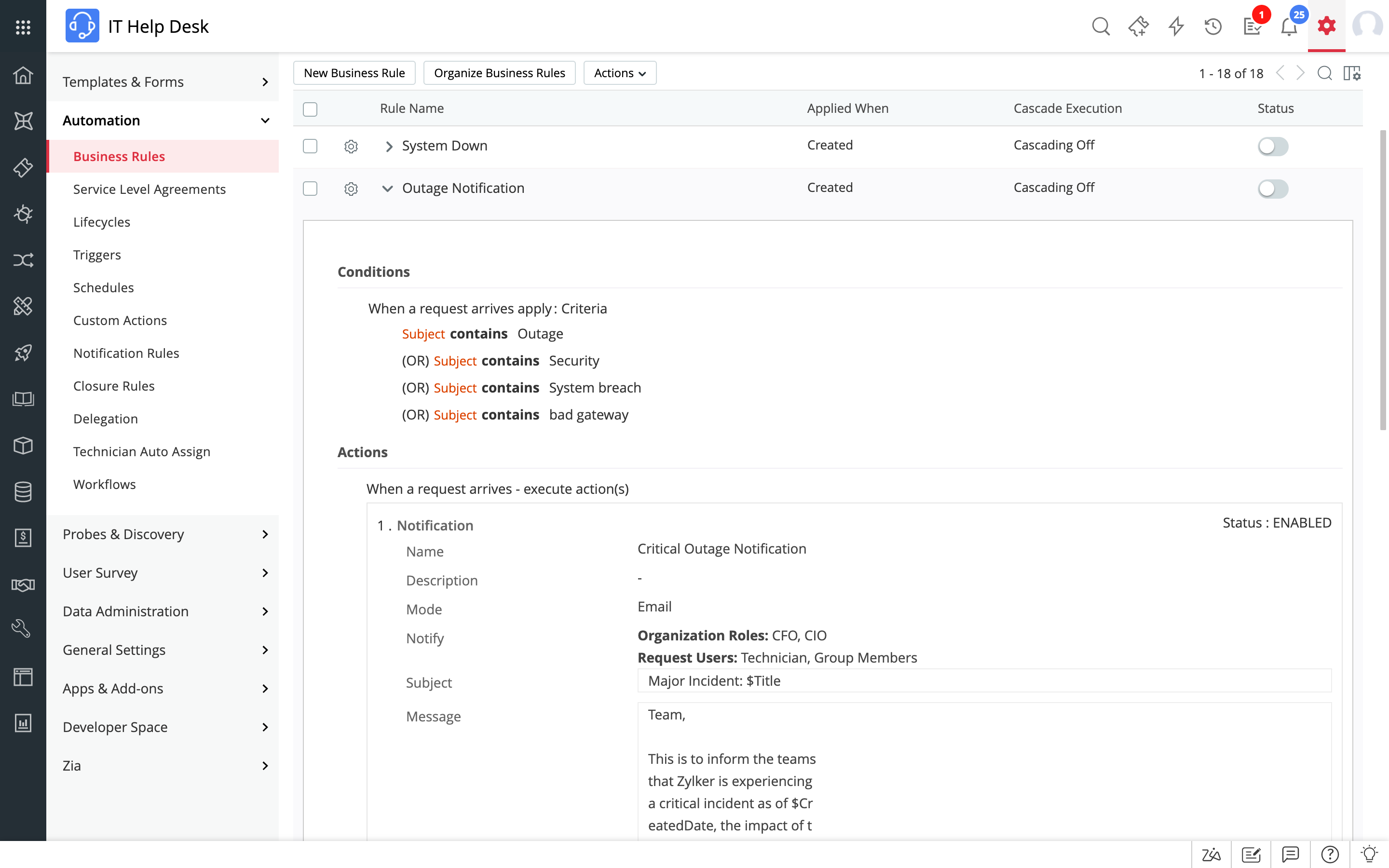 - Enable 24x7 support and allow users to find answers to trivial questions and perform simple service desk tasks with the AI-based virtual agent, Zia.
