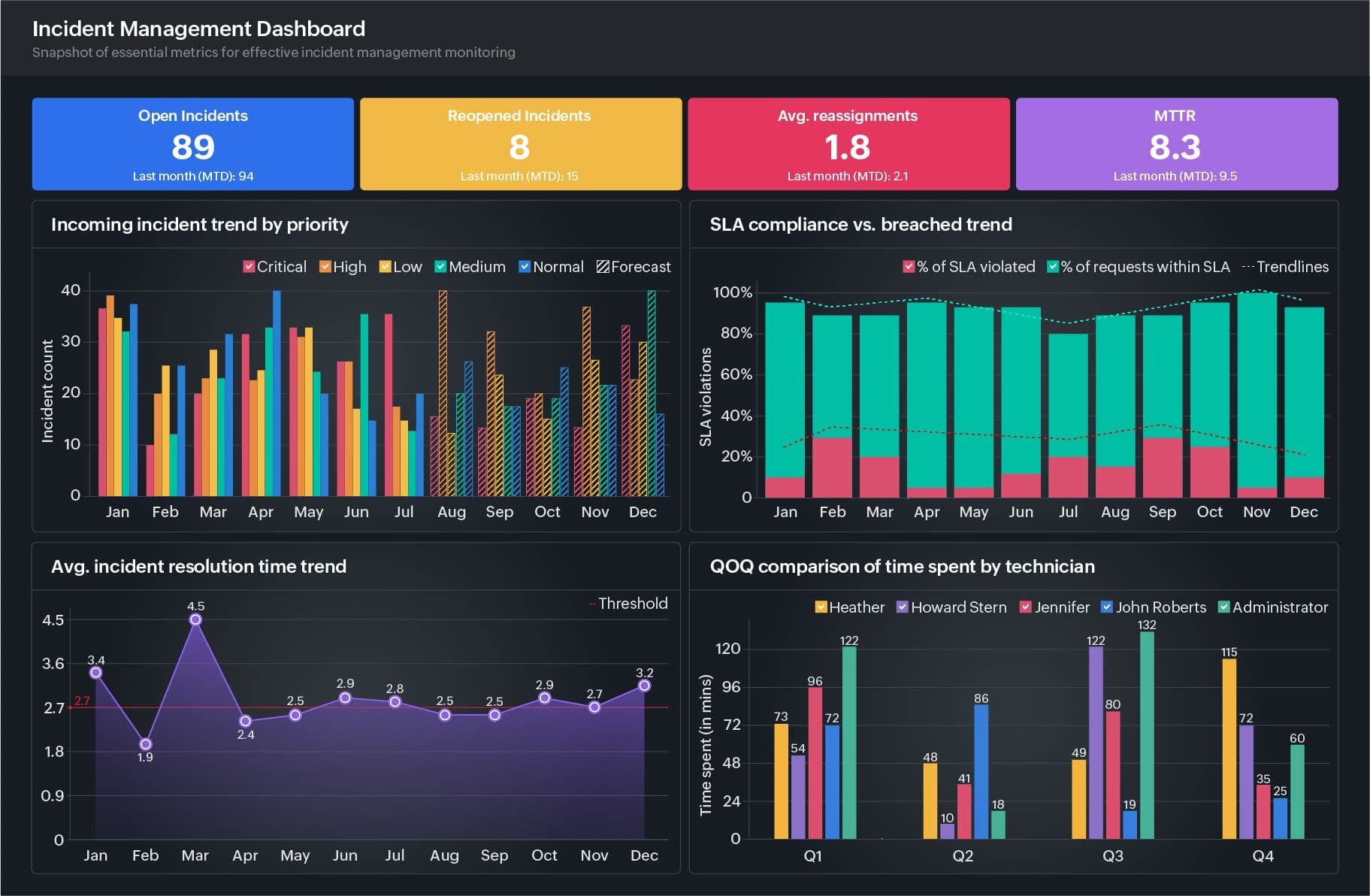 An incident manager's dashboard highlights key metrics and indicators, such as the count of open incidents, their severity levels, and their current statuses. Charts or graphs are commonly utilized to depict trends over time, such as incident volume, SLA breaches, resolution times, number of reopened incidents, and more. These features empower informed decision-making and promote efficient incident management. Figure 1 illustrates a dashboard commonly used by IT incident managers.