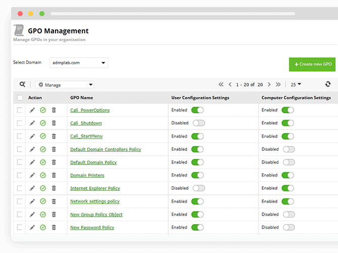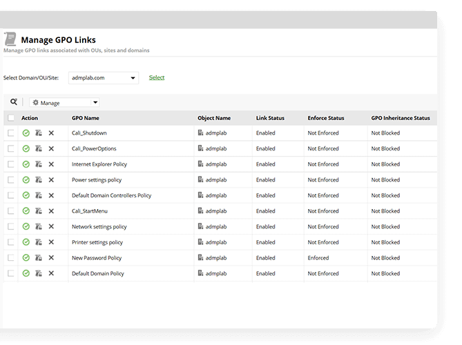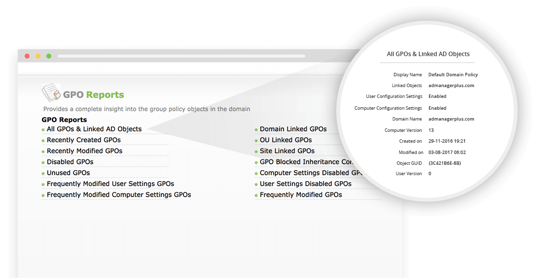 ADManager Plus - это веб-инструмент управления групповой политикой Active Directory, который помогает администраторам, таким как вы, управлять несколькими объектами групповой политики Windows (GPO) одновременно. С помощью подробных отчетов об объектах групповой политики вы можете находить и удалять пустые или неиспользуемые объекты групповой политики, идентифицировать недавно измененные объекты групповой политики, чтобы убедиться в отсутствии непреднамеренных изменений объектов групповой политики, проверять, применяются ли объекты групповой политики к правильному узлу, и многое другое.