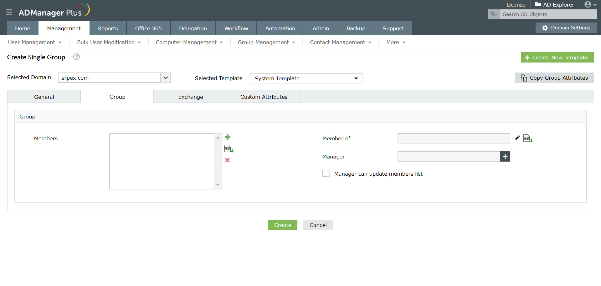 Создание групп безопасности и рассылки AD стало проще с помощью ADManager Plus. Вы можете просто создать группу и импортировать всех ее участников из CSV-файла или выбрать их из списка. Свойства Exchange групп также можно определить в этом же окне. Вы даже можете использовать настраиваемые шаблоны создания групп, чтобы усовершенствовать процесс создания групп в соответствии с политикой и потребностями вашей организации.