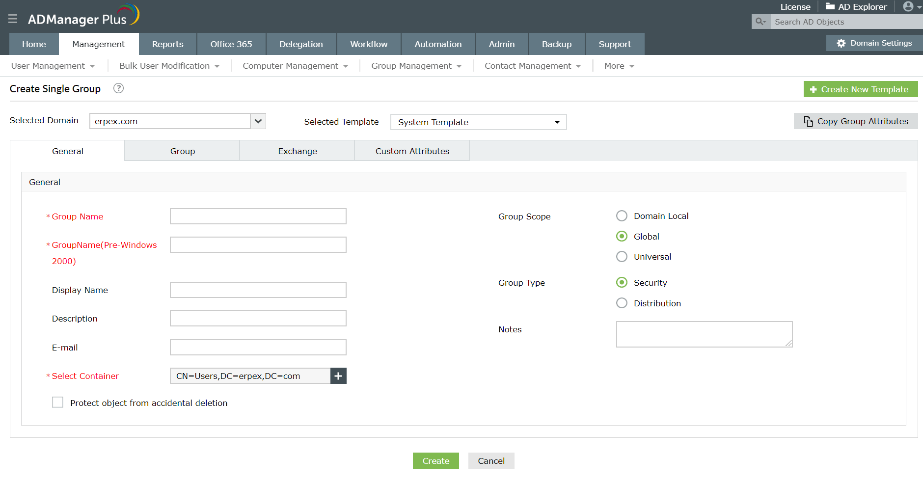Эффективный инструмент управления групповой политикой AD, такой как ManageEngine ADManager Plus, упрощает управление группами. Этот инструмент помогает управлять группами и упрощает управление всеми остальными учетными записями и объектами AD, Microsoft 365 и Exchange из центральной веб-консоли.
